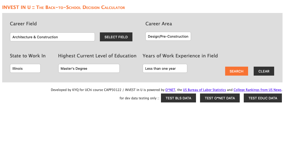 A group project for an introductory computer science course (CAPP 30122) aimed at creating a tool to help prospective students find cusotmized cost-benefit information about enrollment in higher education protrams. The tool analyzes and compares the cost of higher education programs to predicted wages in related job titles.